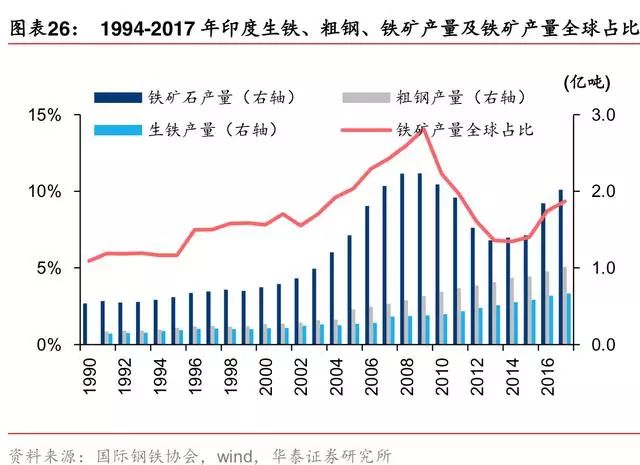 中国铁矿消费举足轻重,增量看南亚、东南亚。根据国际钢铁协会,目前中国粗钢产量约占全球50%,且长流程占比高于世界平均水平,中国的铁矿石消费量占比大于 50%。根据Mysteel、中联钢相关新闻的不完全统计,近年来印度、越南等国钢铁业发展较快,如 印度 2017 年新增粗钢产能 400 万吨,越南 2017-2018 年新增粗钢产能 710 万吨,马来 西亚 2018 年增加粗钢产能 350 万吨。