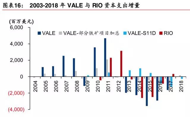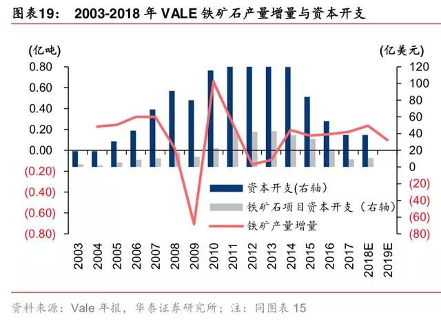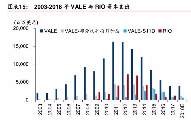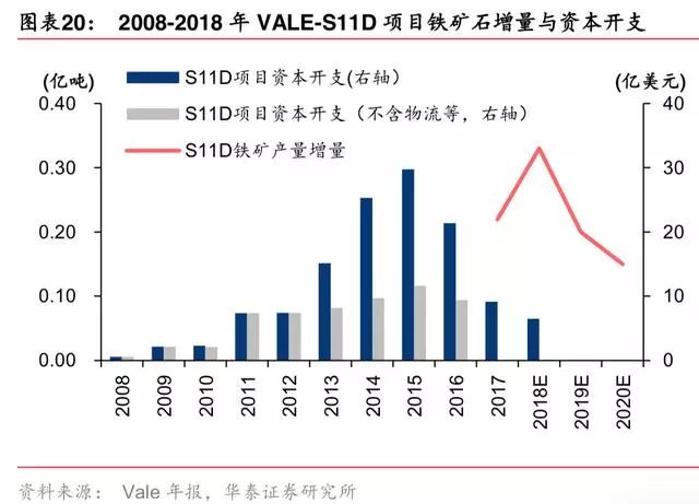 铁矿项目资本支出高峰领先产量增量高峰 3-5 年,此后产量增量逐年下降。S11D 资本支 出始于 2008 年,资本支出高峰是 2014、2015 年,产量增量高峰是 2018 年。