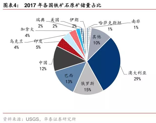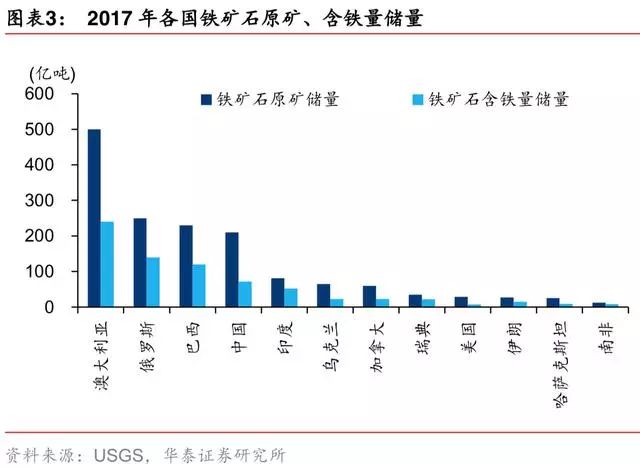 澳大利亚的铁元素储量最丰富。澳大利亚、俄罗斯、巴西的铁元素储量在全球居前三地位, 其中澳大利亚、巴西的铁矿石具有品位高、埋藏浅、杂质少等特点,更具备经济开采价值。