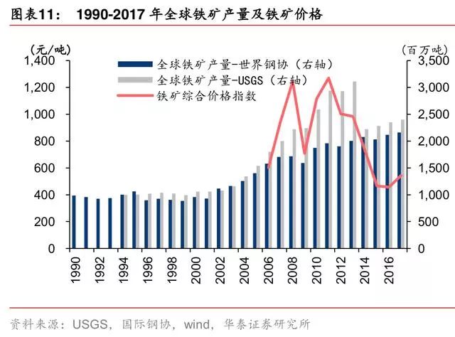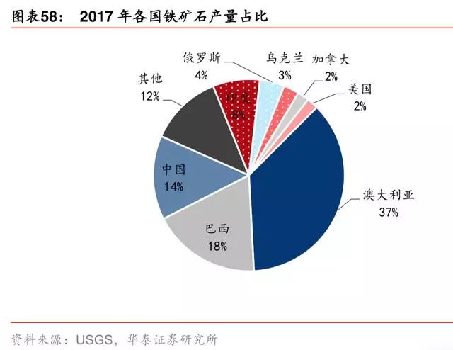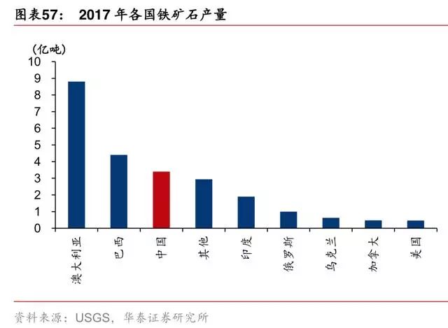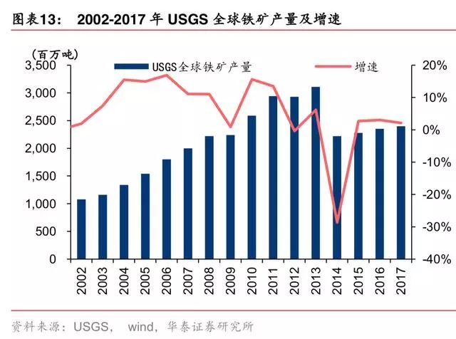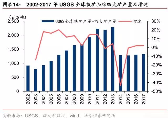据 USGS,2015-2017 年全球铁矿产量缓慢上行,保持 2%-3%的增速,主要来自于四大矿增产,扣掉四大矿产量外的全球产量增速在-1%-2%区间。