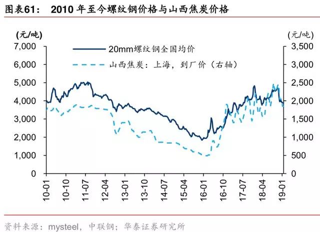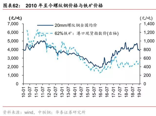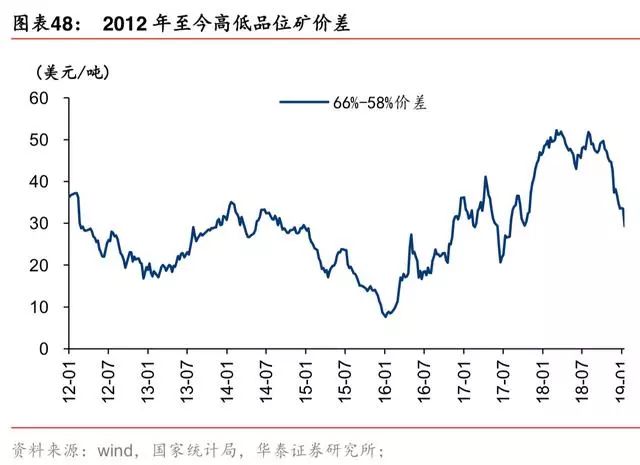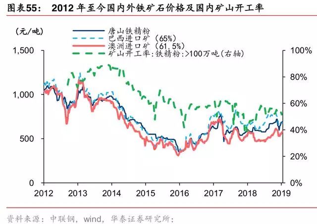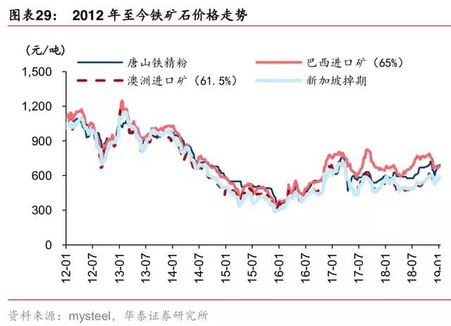 2017年 5 月至 2019 年 1 月,铁矿价格未跟随螺纹钢价波动,前期受地条钢产能去化影响, 钢厂倾向使用废钢扩产、降本,后期受环保限产影响,铁矿需求下行较多、废钢替代增强。