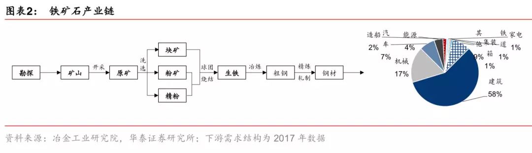 铁矿石入炉前加工环节较多。梳理铁矿石上下游产业链可知,原矿经洗选后有块矿、粉矿、 精粉三种形式。块矿是可直接入炉的高品位矿,粉矿和精矿需人工造块后才能入炉,粉矿、 精粉分别是生产烧结矿、球团矿的主要原料。高炉生产铁水,炉料由铁矿石、焦炭及造渣 用溶剂(石灰石等)组成,铁水再经转炉、轧制等环节成为建筑、机械等终端可用的钢材。