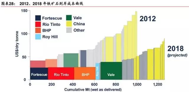 四大矿成本下移,其他矿逐渐退出。四大矿山的铁矿项目资本支出高峰期出现在2012-2013年,产量爬坡期出现在 2015-2018 年。期间,四大矿低成本产能不断投产,行 业现金成本下移,相较于 2012 年,2018 年矿山成本整体下降约 38%。众多非主流矿现 金成本高于四大矿山,在铁矿价格下降的 2014-2015 年多因现金流亏损停产乃至退出市场。