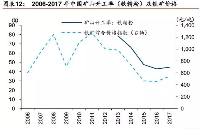 2014年以来,四大矿总产量维持正增速,而四大矿以外的矿山产量在2014年出现了较大的负增速,中国的铁矿矿山开工率也在 2014-2015 年一路走低。