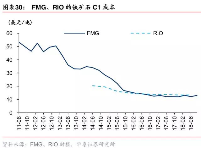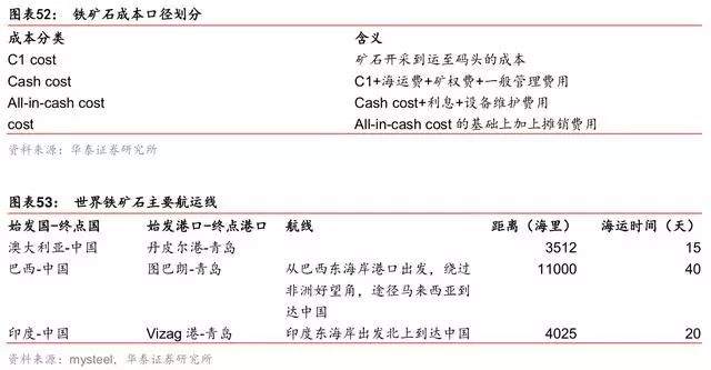 C1 cost 即为铁矿石现金成本线。通行的铁矿石成本划分有C1 cost、cash cost、all in cash cost 及 cost,从铁矿石开采企业的角度看,摊销费用、设备维护费用、利息及矿权费都是 固定成本或固定费用,仅开采成本、运至码头的成本及海运费随铁矿石产量变动,这部分 为可变成本。海运费与全球航运市场供需及油价挂钩,非铁矿公司能决定;开采成本及矿 石运至码头(多为铁路运输)大致为固定数,即为公司决定是否生产的现金成本线。