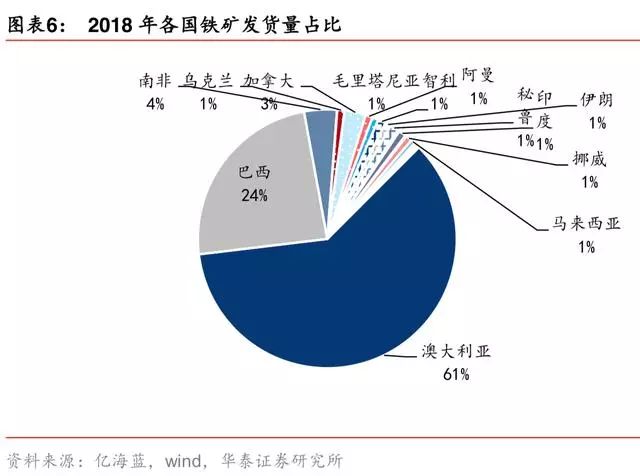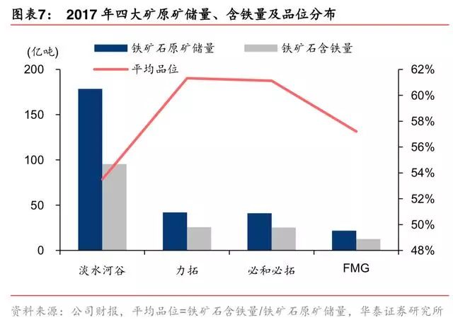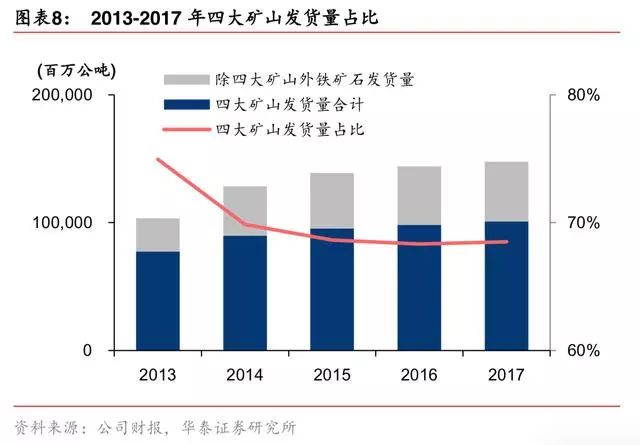 2017年四大矿山发货量占比 69%。据 wind,2017 年四大矿铁矿产量 11 亿吨,产量、 发货量占比分别为 45%、69%。四大矿是全球主流矿商,大型钢厂均使用力拓 PB 粉、块。