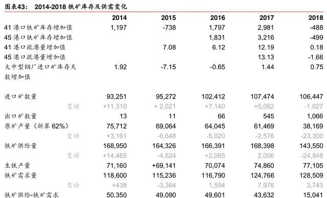 供给下行、需求上行,促港口库存下降。2018 年,进口矿、国内精粉产量双下降,铁矿 需求上行,叠加疏港量、钢厂进口矿库存基本稳定,港口铁矿库存下行较多。铁矿石港口 库存自 2015年下半年开始上行,至 2018 年 6 月达到高点,此后开始下行。