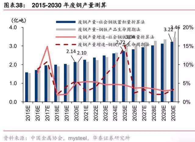 据中国金属学会,废钢产量有社会钢铁蓄积量折算法、钢铁产品生命周期法两种测算方法, 预测得 2019年废钢产量在 1.98-2.04 亿吨区间,增速为 2%-4%,增量为 400-800 万吨。