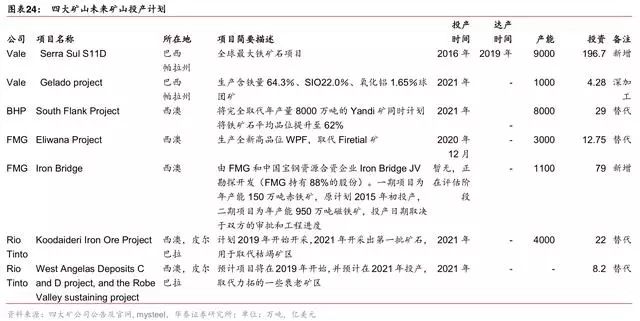 据 Mysteel 及公司官网,Rio Tinto 的 Silvergrass(年产 1000 万吨)在 2018 年上半年达 产,预计 2019 年新增产量较少。据 FMG,FMG 为改变其低品矿为主的局面,于 2018 年底投产全新高品位 WPF,品位 60%,预计出口量 1000-2000 万吨,WPF 主要用于替 代前期低品的超特粉和混合粉。