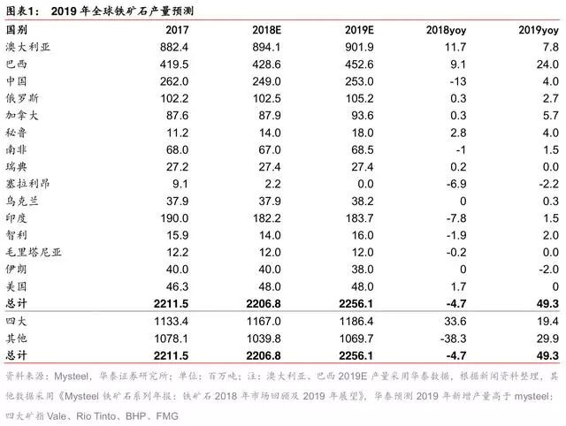 四大矿 2019 年增量或不足 2000 万吨。据 Mysteel,2019 年 Vale 的 S11D 预计有 2000 万吨增量,但其中 1000 万吨将用于替代 Vale 其他系统,因此新增量约 1000 万吨。2019 年 1 月 25 日,Vale 一处尾坝矿发生溃坝,造成多人死亡及失踪。随后,Vale 宣布将投资 50 亿雷亚尔关停这些水坝,整个关停过程可能持续 1-3 年的时间。据 Mysteel,该计划或 将影响 4000 万吨铁矿石产量,其中包括 1100 万吨球团矿。据 Mysteel,2019 年 Vale 或 因此事故影响 850 至 2780 万吨产量,可能由其他矿区增产补齐缺口。