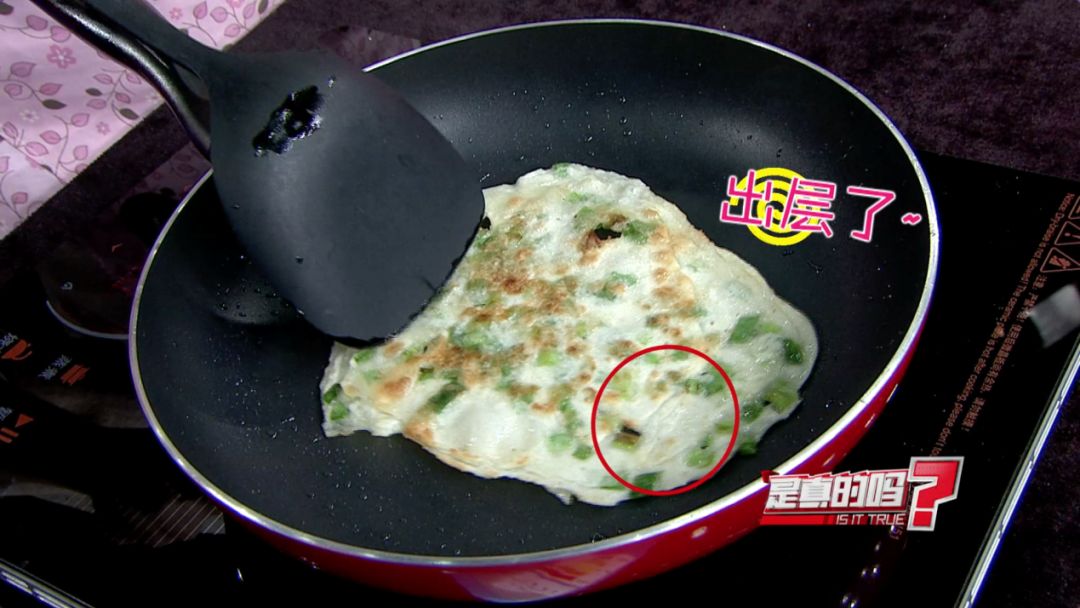 在平底锅里倒入油,放入擀开的饺子皮面饼,烙熟,葱油饼就完成了。烙熟的葱油饼薄薄的呈金黄色,口感外焦里脆,隔壁的小朋友都馋哭了。