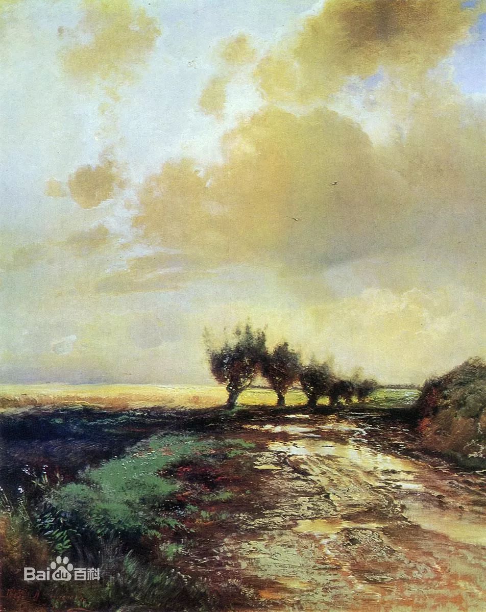 《道路》是萨符拉索夫的另外一幅主要代表作。以常见的俄罗斯村边小道为题材,描绘了大雨过后,乌云散去,阳光初露时大自然千变万化的美丽景色,传达了画家对充满泥土气息的乡村景色的爱恋之情意。画家使用的笔触、光与色都服从于表现自然界真实的景物和气氛。它使我们看到的是完全溶化在自然物象之中的画家高超的技巧。