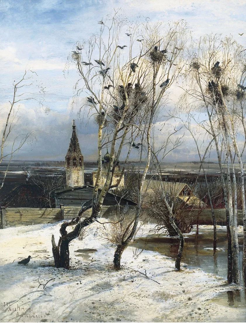 这是件俄罗斯现实主义风景画的标志性作品,它使人产生怀旧思乡的联想。积雪虽未完全退去,寒冷的气氛还死气沉沉地笼罩着大地,但自然生命的强音已开始来临,归来的白嘴鸦预示着春天将要到来了。萨符拉索夫在自己的风景画中倾注了对祖国的真挚情感,因而使每一个欣赏者都备受感动。