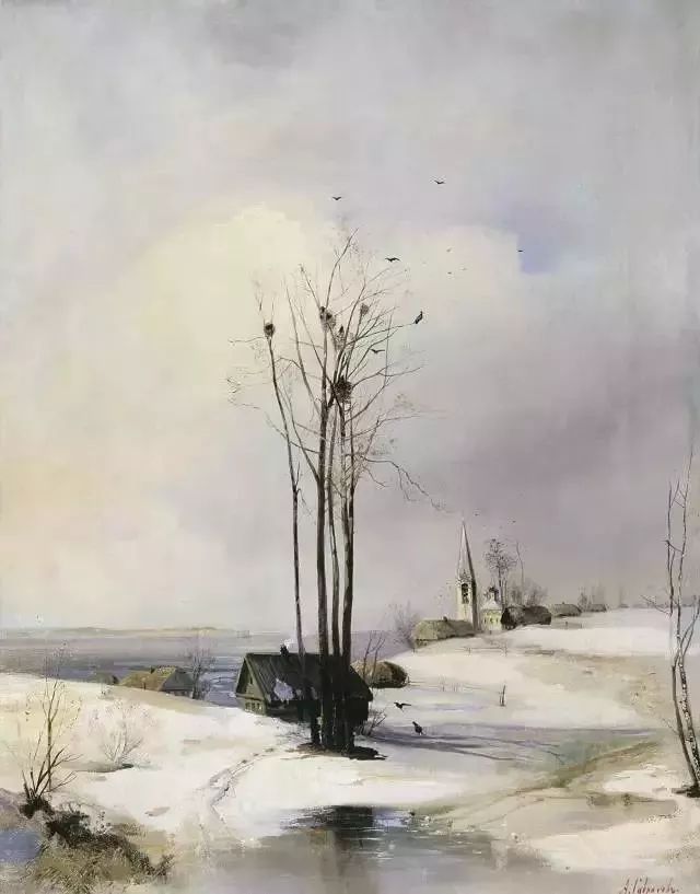 《白嘴鸦飞来了》 布面油画 62cm×48.5cm 莫斯科特列恰科夫美术博物馆藏