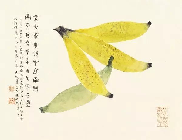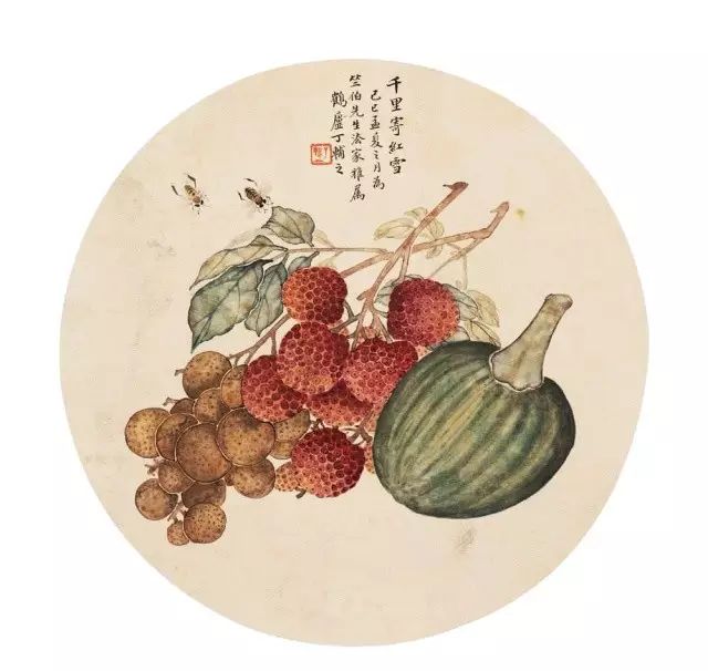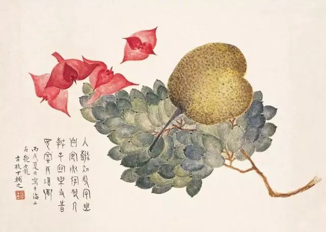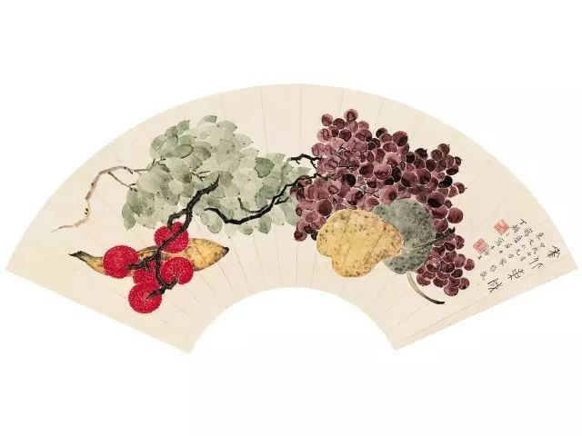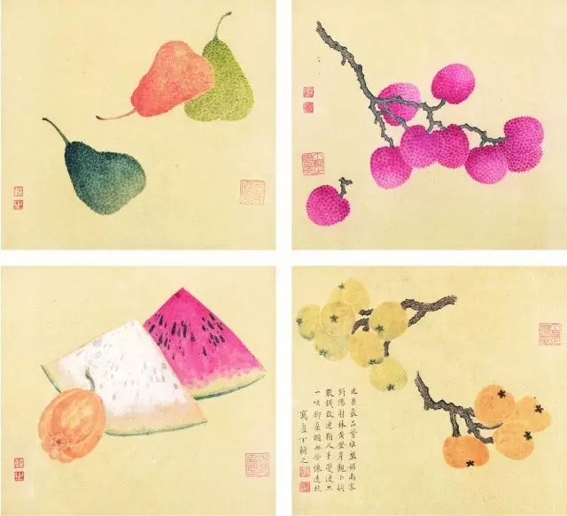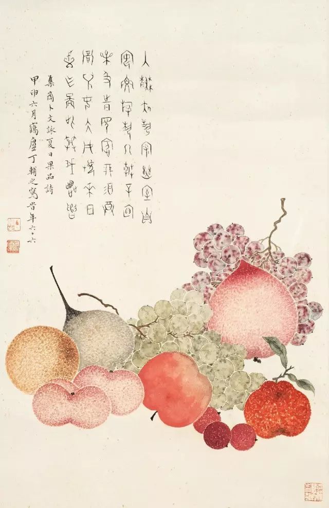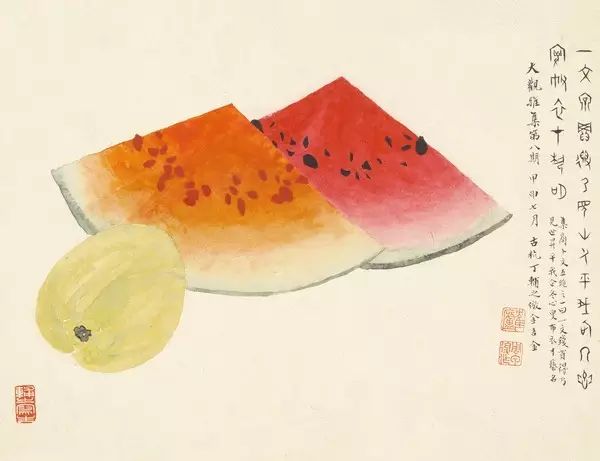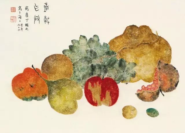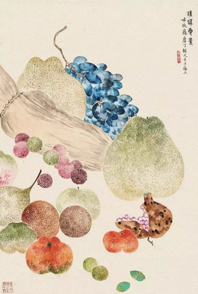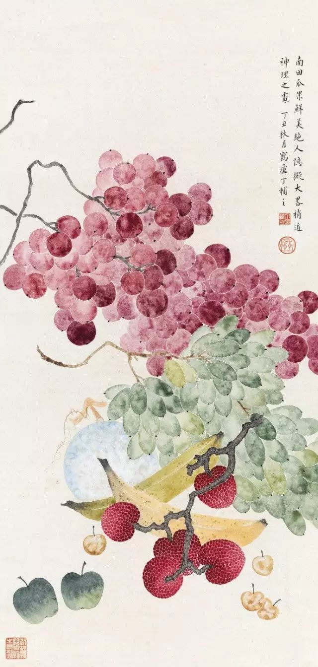 在丁氏笔下的夏季时令鲜果,既无烟火气,亦无脂粉气,从中可窥见艺术家高洁之品性。四是用色优美,作品画面色彩浓丽、明亮,视觉效果相当好。所以,丁辅之的果类作品显示出匠心独具和超凡功力,并往往让海内外藏家难以抗拒,圈内行家则谓“极璀灿芳菲之妙”。