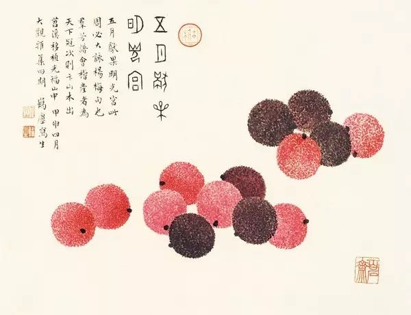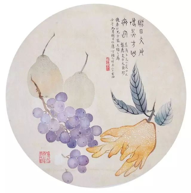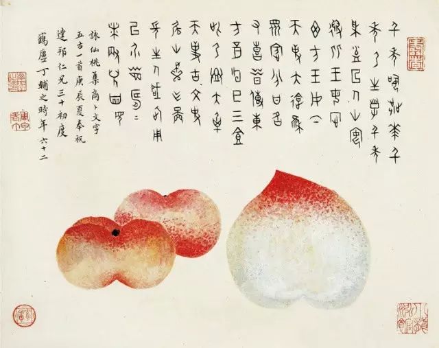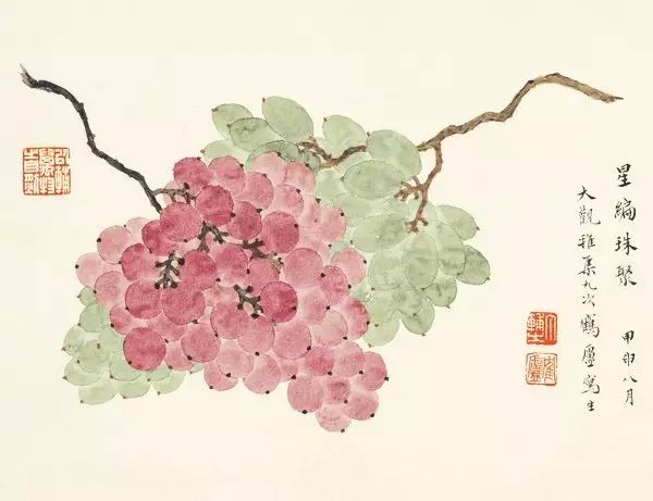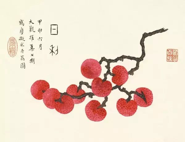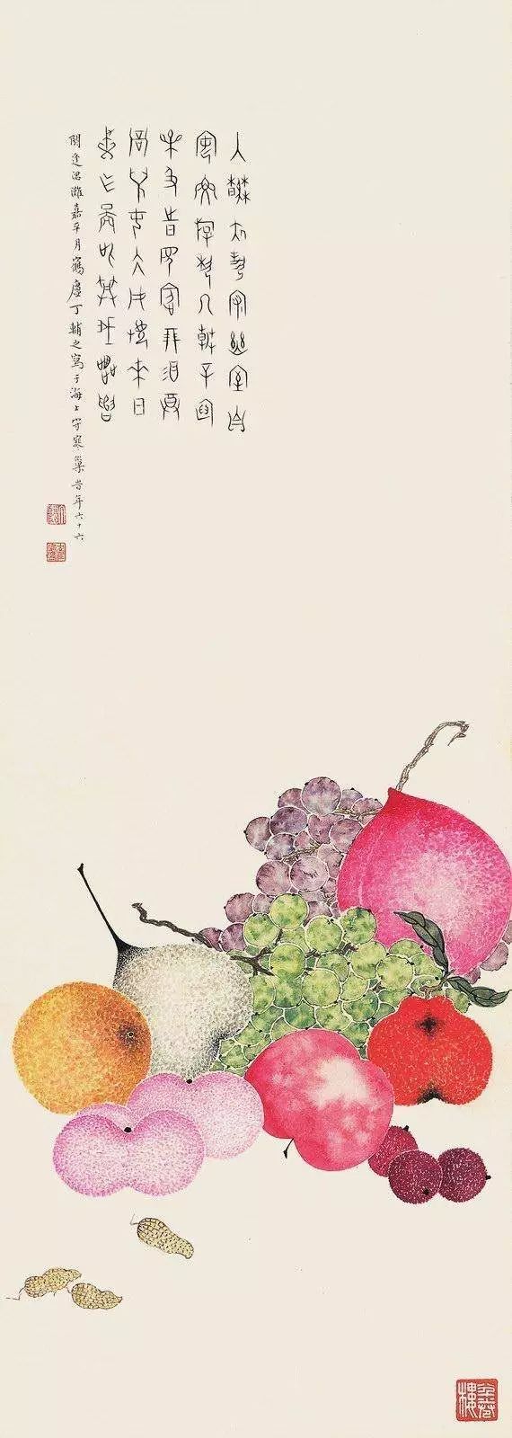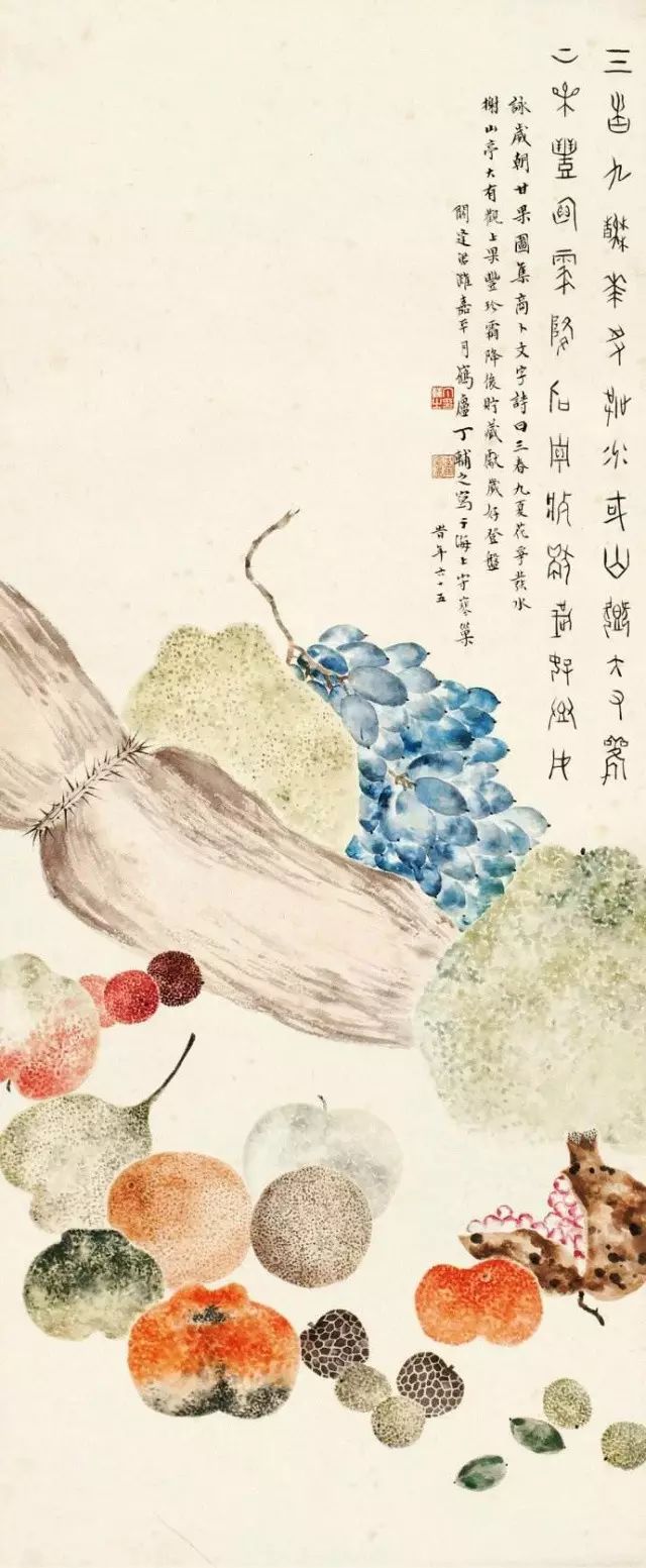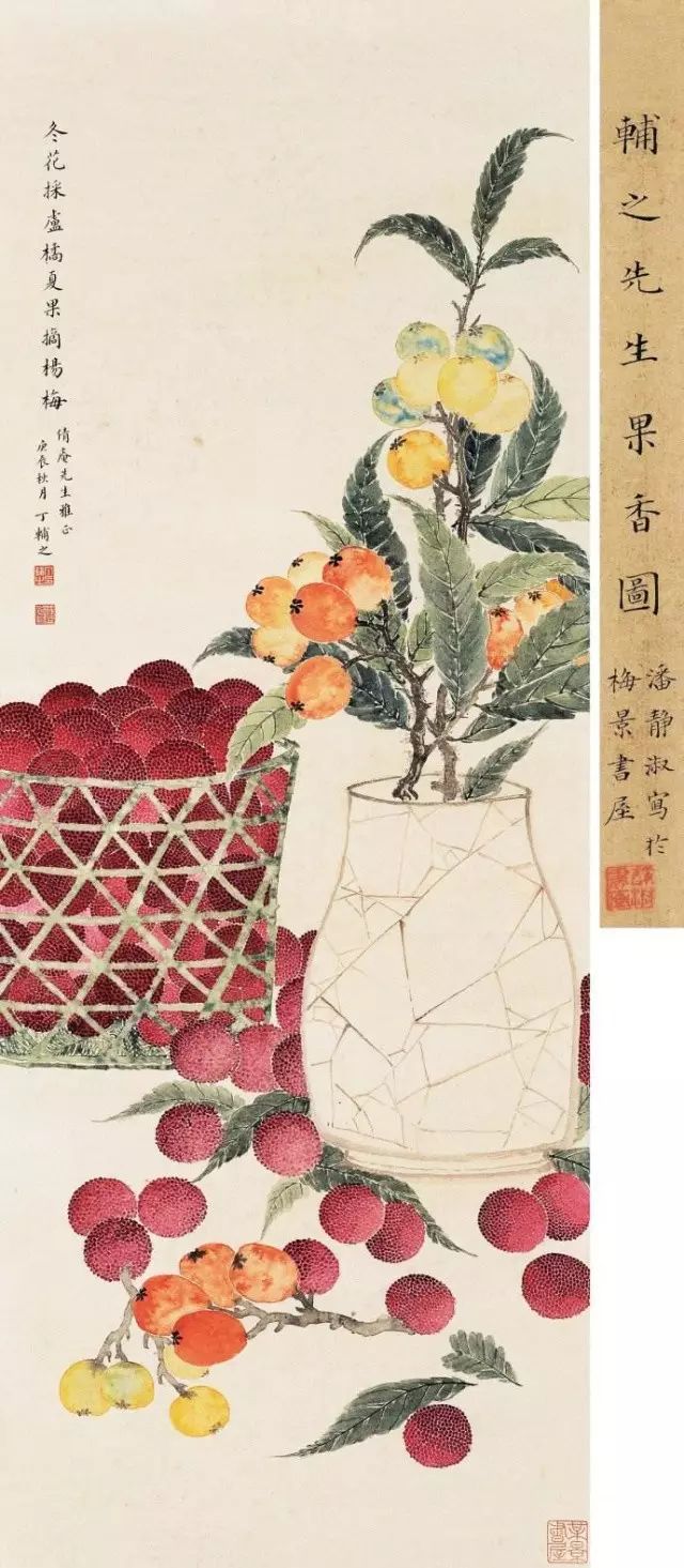 在丁氏笔下的夏季时令鲜果,既无烟火气,亦无脂粉气,从中可窥见艺术家高洁之品性。四是用色优美,作品画面色彩浓丽、明亮,视觉效果相当好。所以,丁辅之的果类作品显示出匠心独具和超凡功力,并往往让海内外藏家难以抗拒,圈内行家则谓“极璀灿芳菲之妙”。
