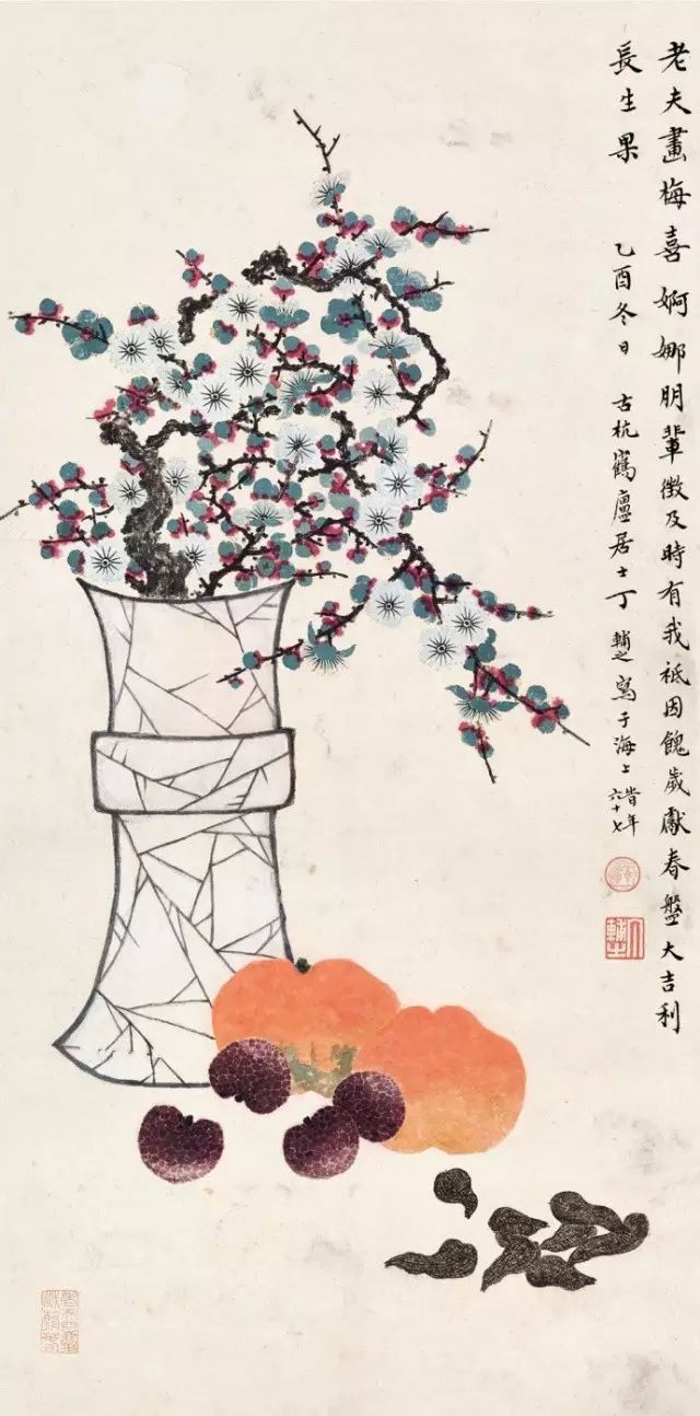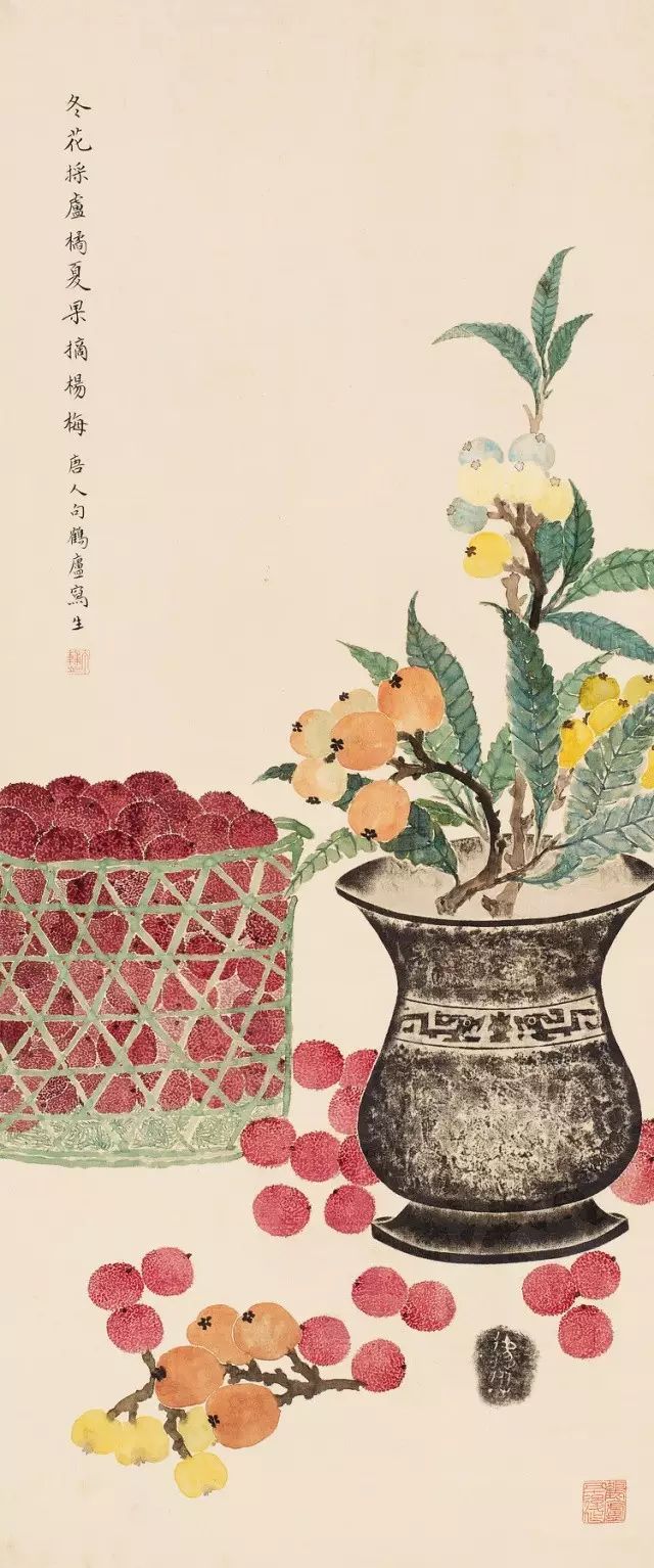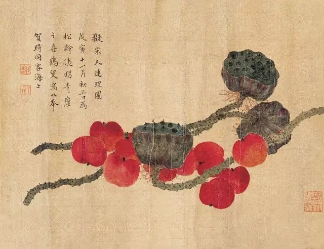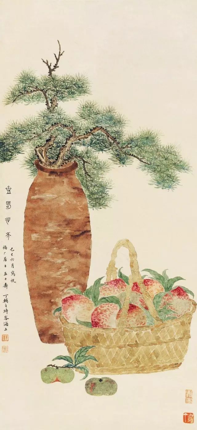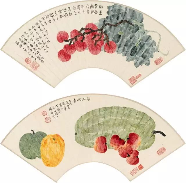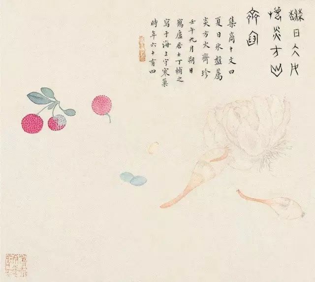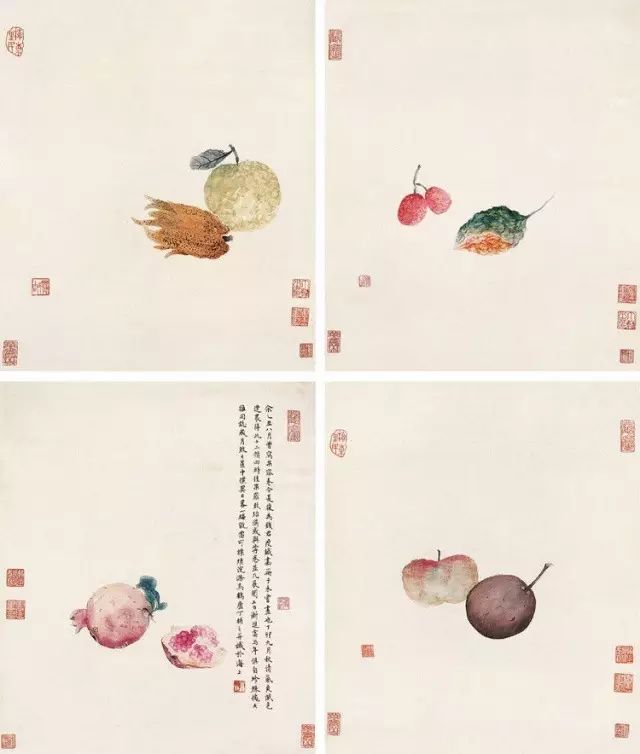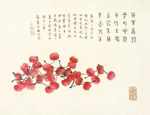 在丁氏笔下的夏季时令鲜果,既无烟火气,亦无脂粉气,从中可窥见艺术家高洁之品性。四是用色优美,作品画面色彩浓丽、明亮,视觉效果相当好。所以,丁辅之的果类作品显示出匠心独具和超凡功力,并往往让海内外藏家难以抗拒,圈内行家则谓“极璀灿芳菲之妙”。