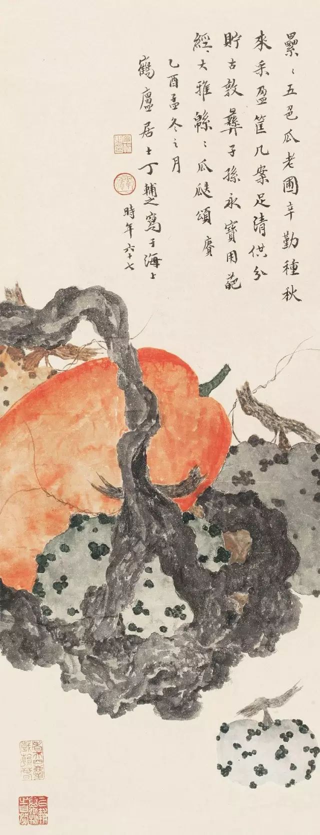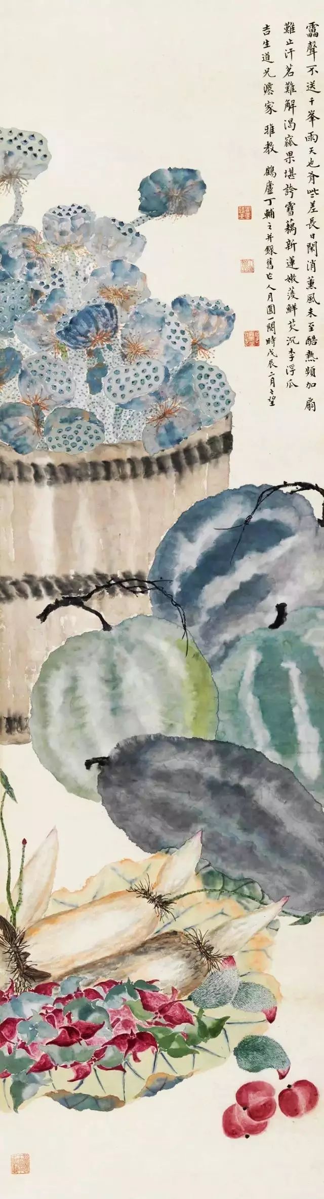 瓜果时蔬在生活中极其易见,如此朴实无华的平淡,在丁辅之笔下确是雅致高远。也正是这市井日常,却寄叙着人间烟火,道尽了人生。