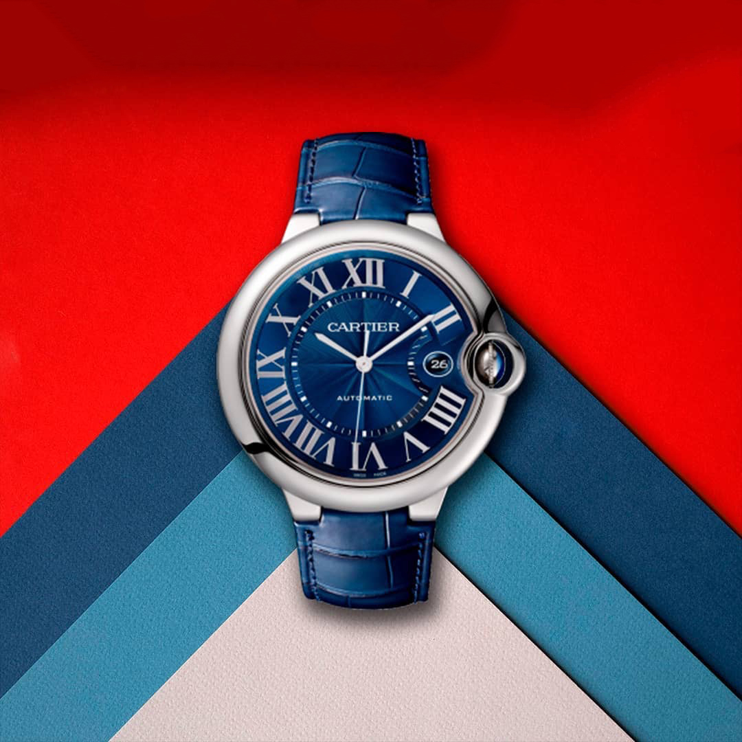 随着蓝盘手表的兴起,卡地亚在2018年也推出了一款蓝色表盘的大号蓝气球腕表,以静谧之蓝铺张主调,以明透之镜捕捉光影,简约大气而不失优雅,深邃稳重却不失华贵。