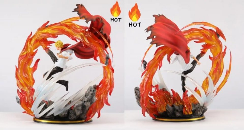 从侧面和背面来观赏这款手办,我们能够看到更为飘逸的斗篷姿态,而那一束自地台上方腾跃而起的环形火龙再加上囿于山治凌厉脚功激荡而起的龙卷气旋风暴,种种形态交织之下,无疑让这款手办变得美不胜收呢。