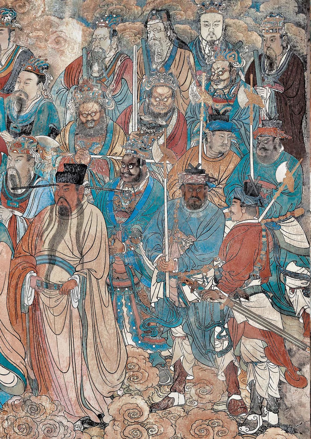 这些武将身形矫健,气势阳刚,画工虽使用同种线条,但顿挫多变,刚劲流畅,将衣物紧贴身体的紧实感表现的真实不虚,人体结构与衣纹的关系表达的明确无误,为永乐宫三清殿壁画的代表作之一。