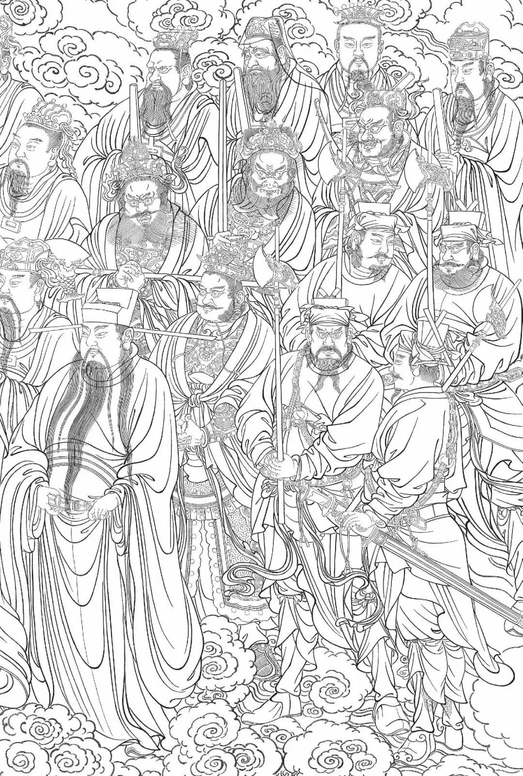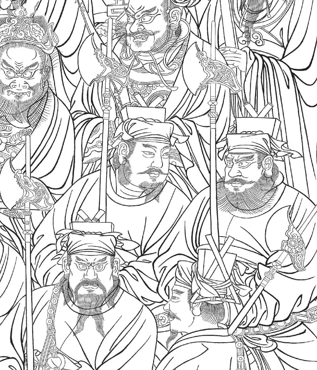 本书为了让广大艺术爱好者更好地体会永乐宫三清殿《朝元图》壁画中线条的精妙,特选取《朝元图》壁画中具有代表性的人物与场景,以白描形式呈现。希望艺术爱好者们在学习的过程中,细细体会古代画工如何对线条的起止、轻重、聚散、藏露、虚实、动静、曲直等进行考虑,将宏观的构图和细致的绘制相融合,达到让画面统一而又富有变化,威严而又气韵生动的目的。