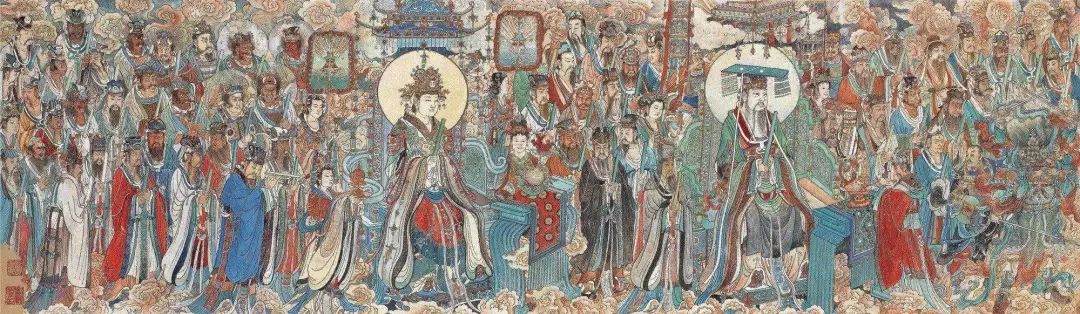 三清殿是永乐宫的主殿,殿内四壁及环绕神坛的扇面墙壁绘满壁画。壁画高4.26 米,总长94.68 米,绘制总面积为403.34 平方米。