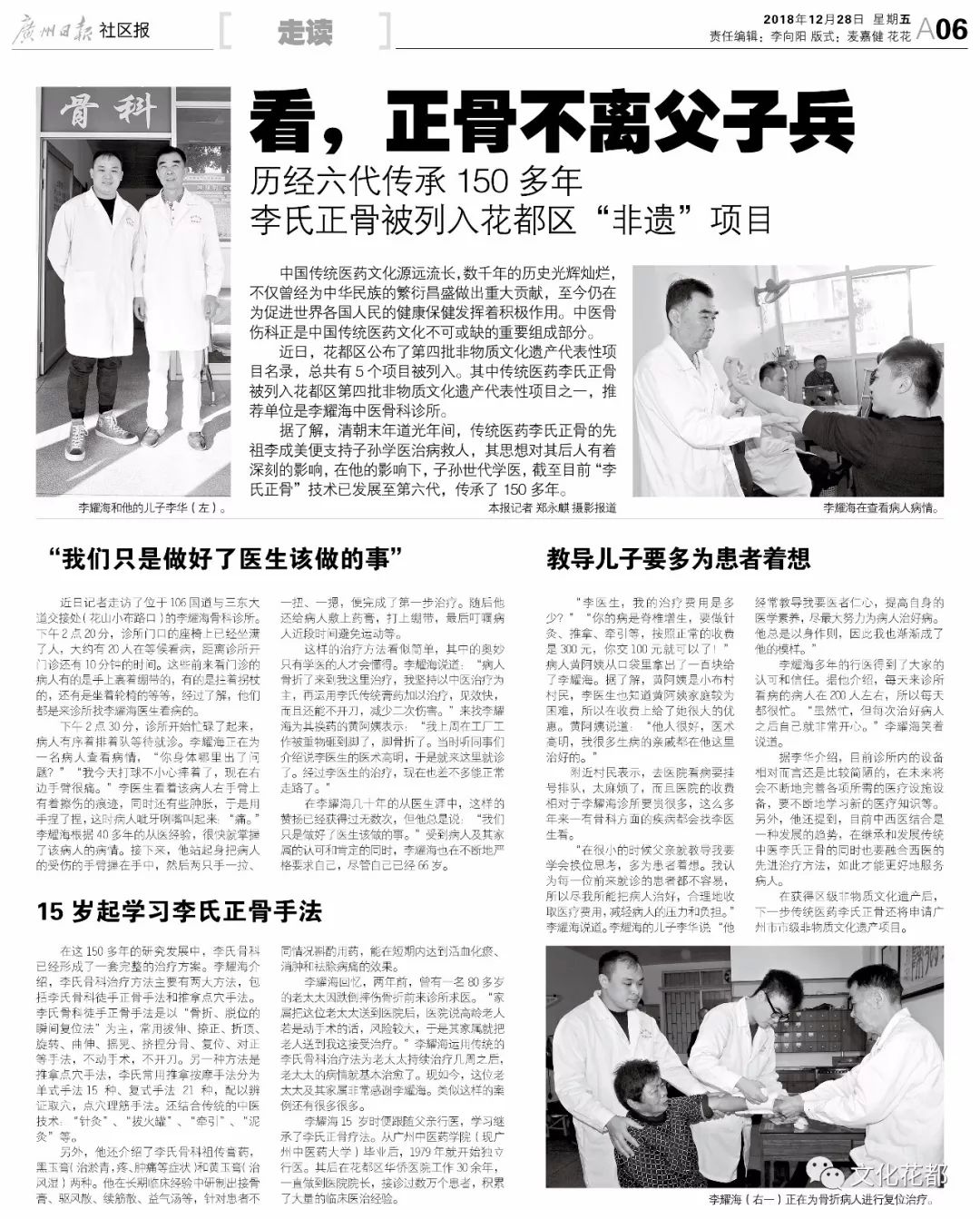 广州日报报道李氏正骨第五代传承人李耀海和第六代传承人李华