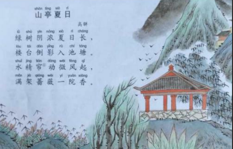 绿树阴浓的夏天昼长夜短,楼台的影子倒映在池塘里。微风拂过,水晶帘幕轻轻摆动,那满架的蔷薇,艳丽夺目,院中弥漫的是阵阵清香。