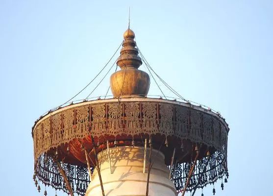 顶部塔刹分为三部分,底层为略小一些的须弥座,托起节节拔高的锥体十三重相轮,又称“十三天”。相轮顶处为一个伞状之盖,称为华盖,含悲智双运降服邪恶之意。