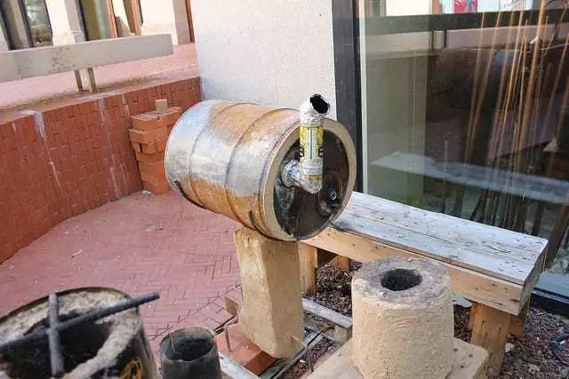 火箭炉桶式烤箱由各种可见的材料制成,包括砖块,粘土和桶。