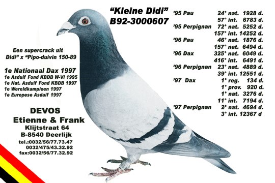1997年,小迪迪凭借傲人的成绩,几乎稳坐了KBDB鸽王宝座。于此同时,有人报价3百万比利时法郎(约12万美元)购买小迪迪,迪沃斯答应了。但就在这个时候,令人惊讶的事情发生了,另一羽神奇的鸽子以恐怖的成绩超过了“小迪迪”,跃升长距离鸽王全国排名的首位,小迪迪屈居第二。