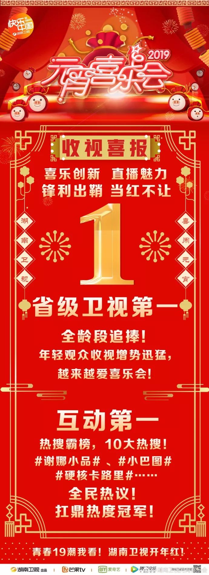 湖南卫视以青春年轻态创作辐射全年龄段,打造了一台为全民点赞、为猪年喝彩的圆满盛典。在创新升级的同时,更为全民带来潮流感和愉悦感,满满的温馨与感动夹杂其中。作为国内一线卫视,湖南卫视将元宵喜乐会的品牌不断深化,2019年元宵喜乐会带来的开年红,或将开启湖南卫视在新一年的创新征途。