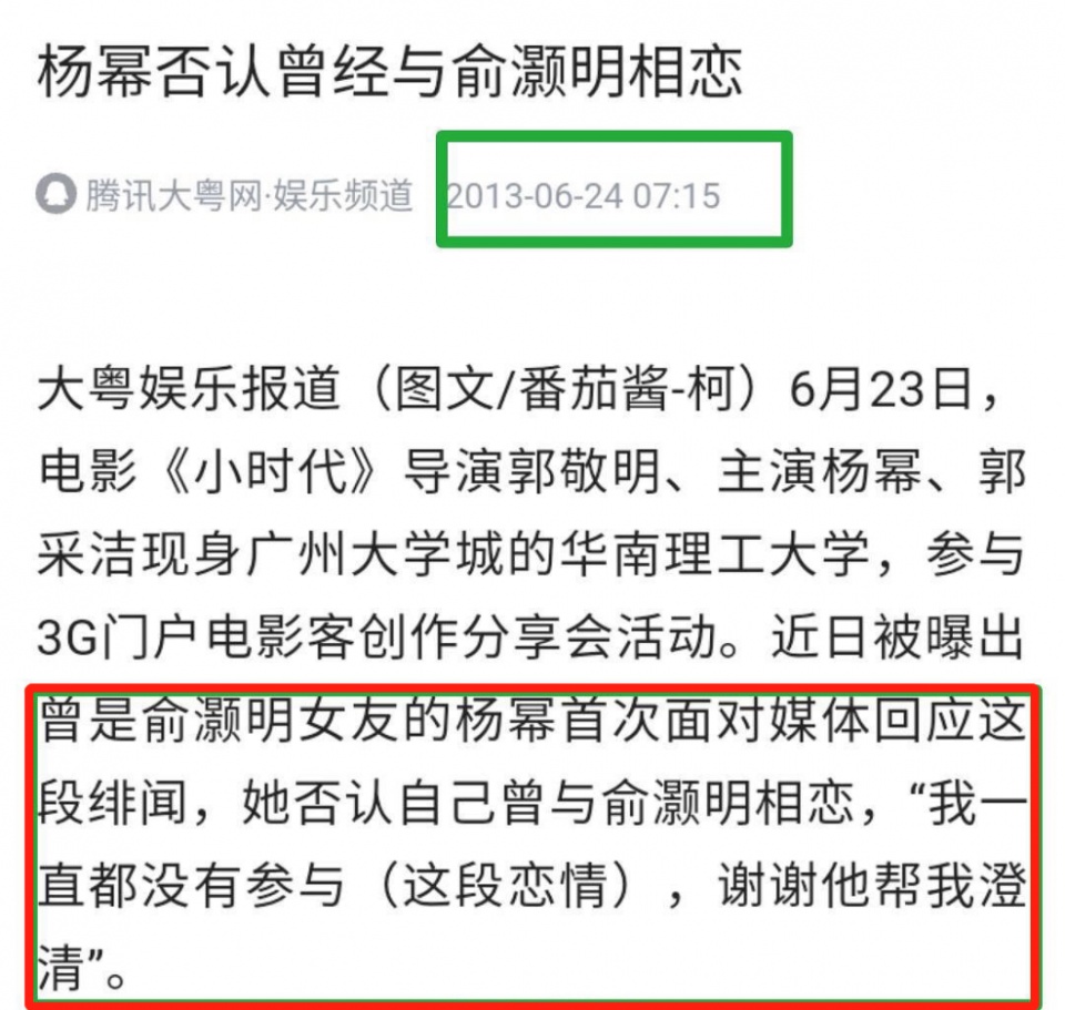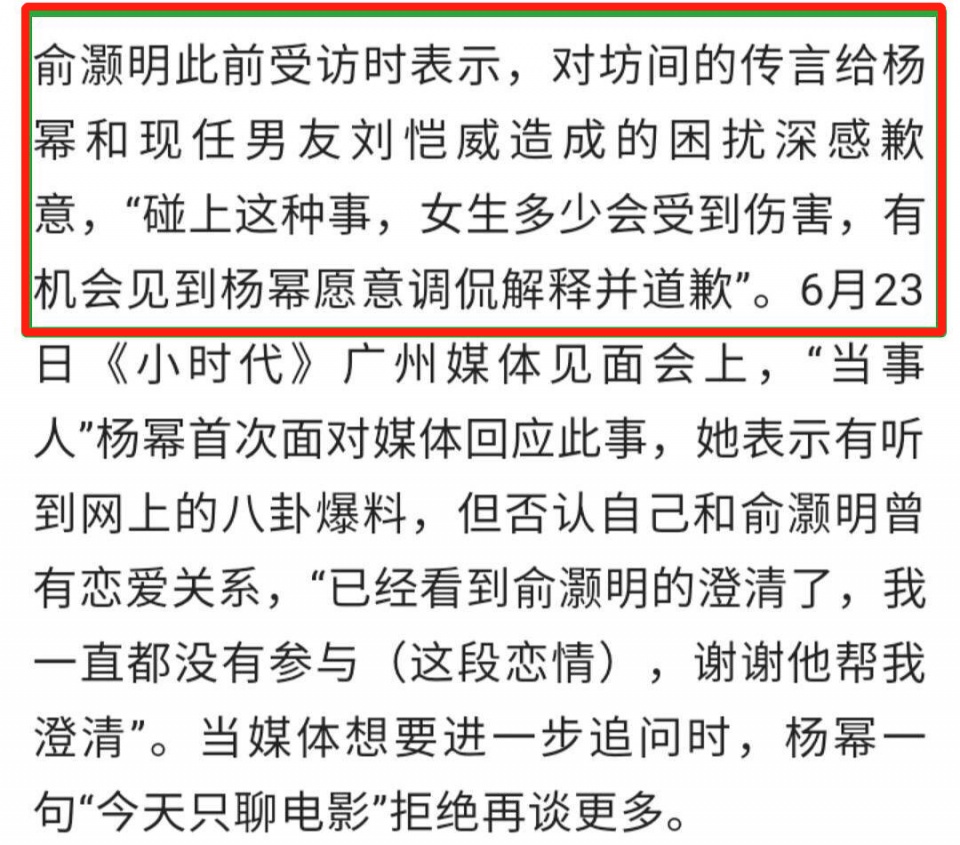 2013年时,杨幂和刘恺威正处于热恋。而俞灏明在某次接受采访时,也表示因为坊间的传言给杨幂及当时其现任男友刘恺威造成的困扰感到抱歉,他还称如果有机会见到杨幂愿意进行道歉。