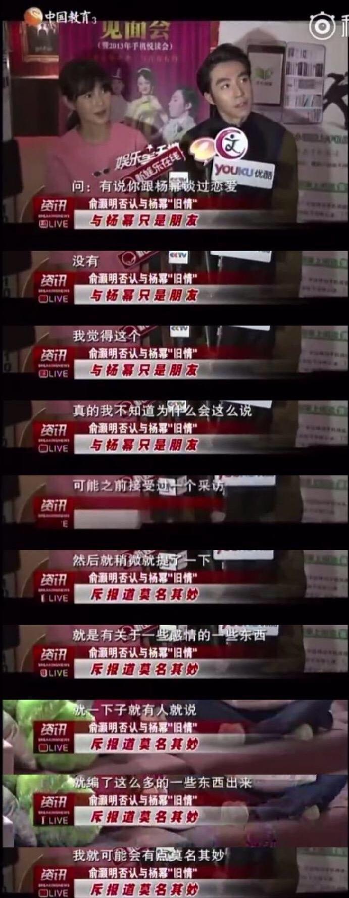 但是,其实很久以前,在俞灏明和杨幂的恋情传的沸沸扬扬之时,俞灏明就已经亲口否认过这个传言。当年有记者开门见山地采访俞灏明是否有谈过恋爱,而当时俞灏明也是斩钉截铁地否认:“没有。”而且他说,自己不知道为什么会这样说,可能是之前有采访,只是提了一下感情的事,然后就有人编了这么一个东西出来,他对此也感到莫名其妙。