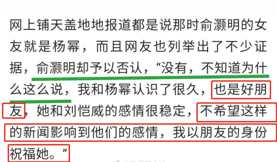 俞灏明当时称,他与杨幂认识了很久,是很好的朋友,不希望因为这样的新闻影响到她与刘恺威的感情,并以朋友的身份祝福他。