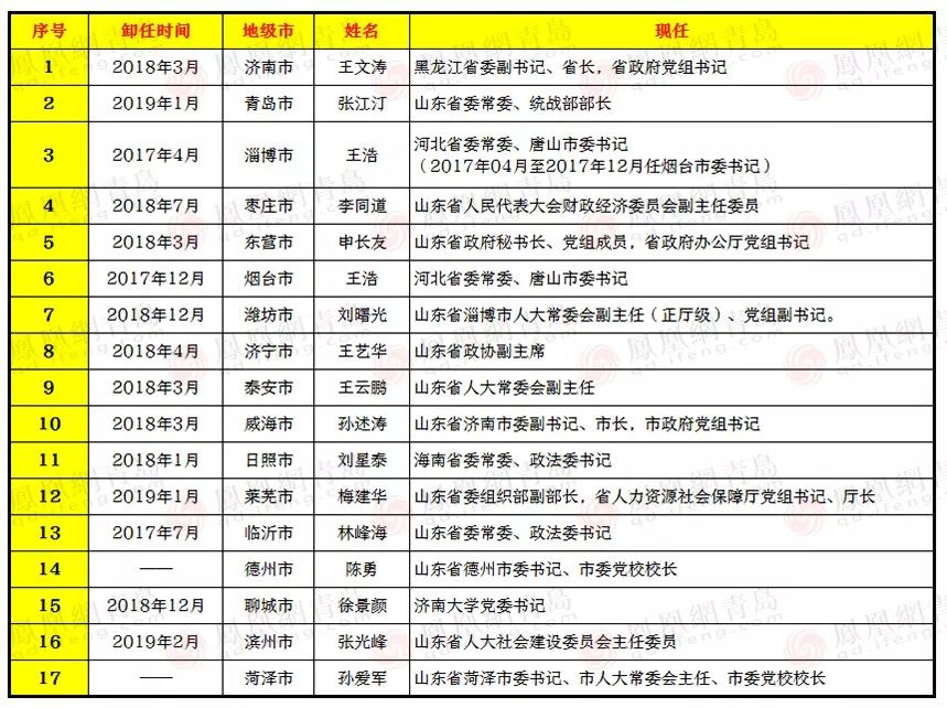 根据公开资料显示,2017年4月至今不到两年的时间里,山东省原17个城市(含撤市设区前的莱芜)中,有15市的市委书记职务有所调整。