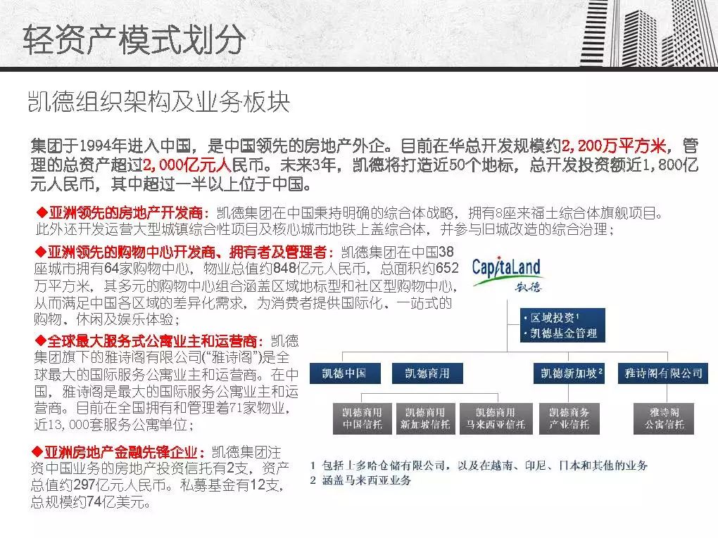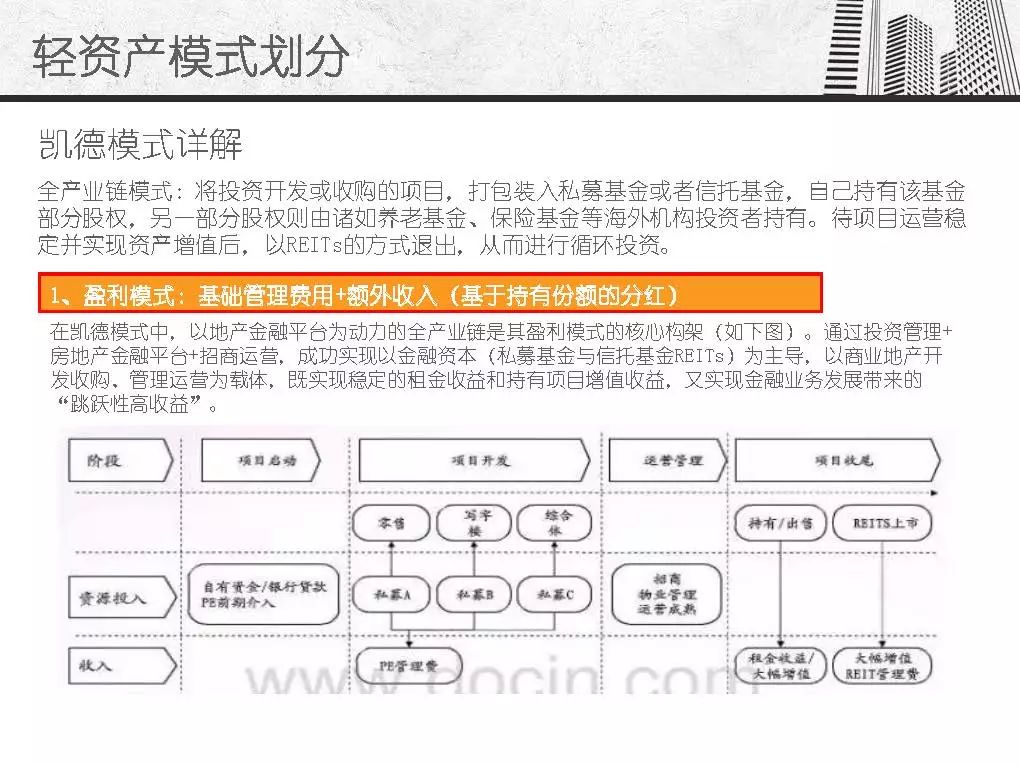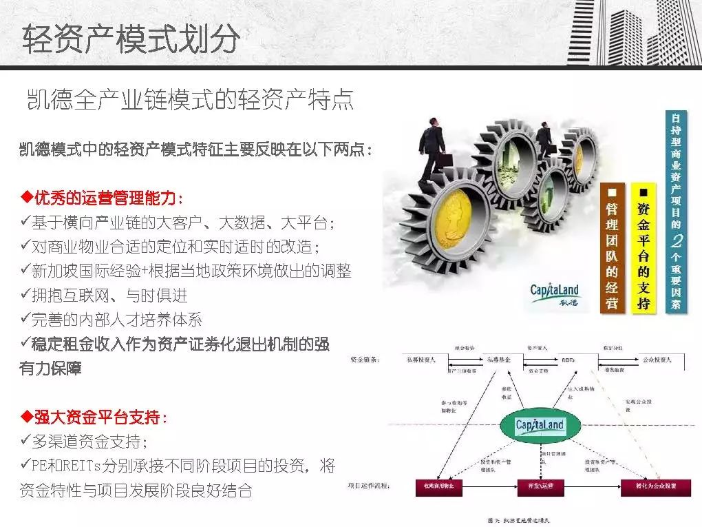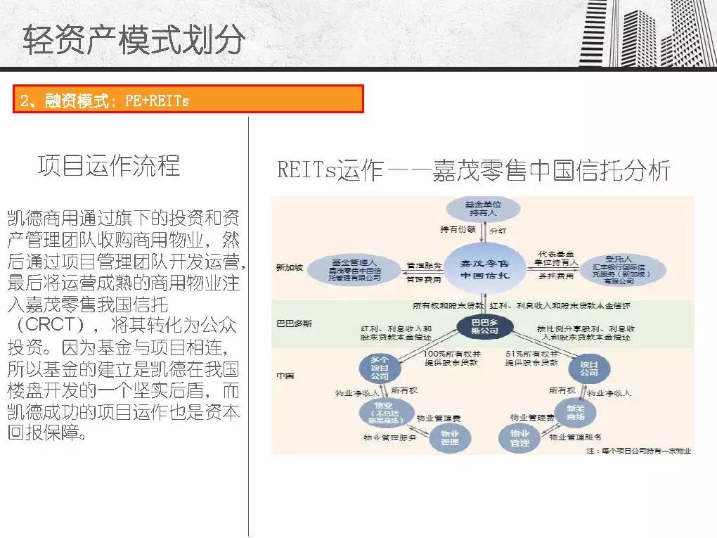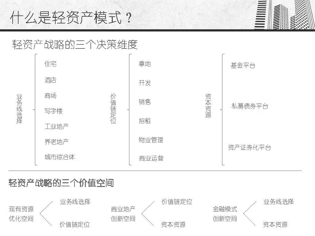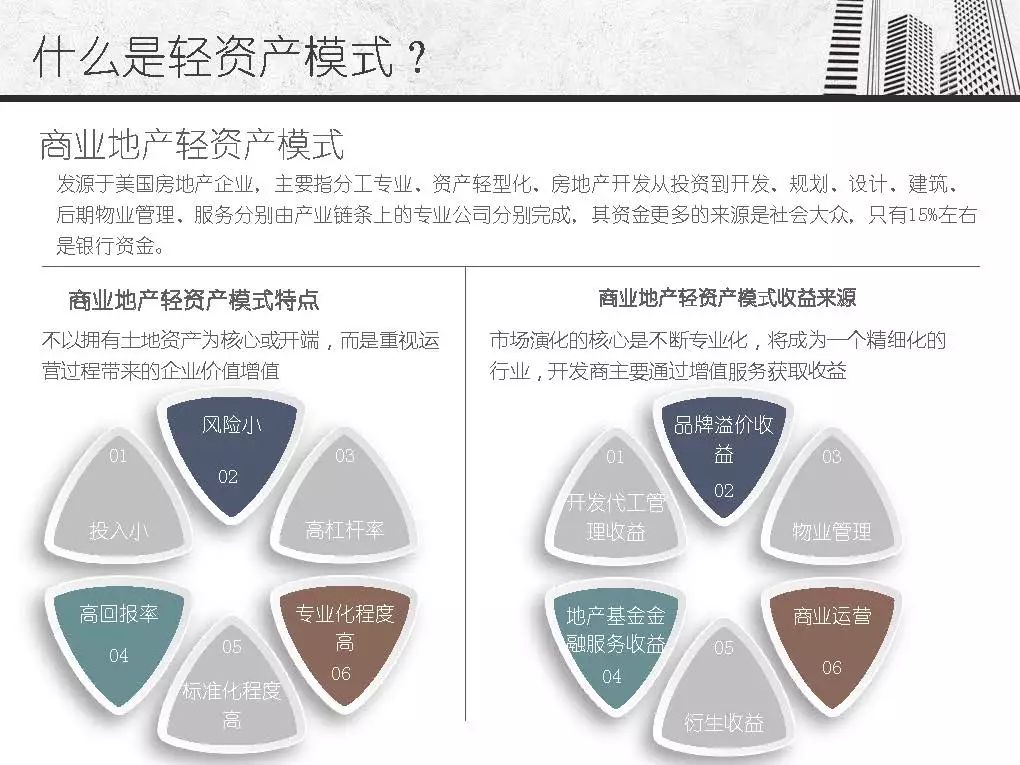 而商业地产轻资产模式发源于美国房地产企业,主要指分工专业、资产轻型化、房地产开发从投资到开发、规划、设计、建筑、后期物业管理、服务分别由产业链条上的专业公司分别完成,其资金更多的来源是社会大众,只有15%左右是银行资金。