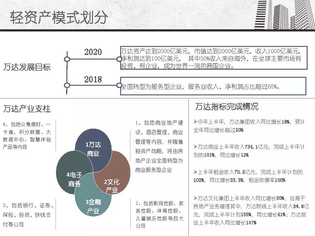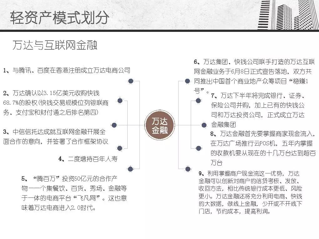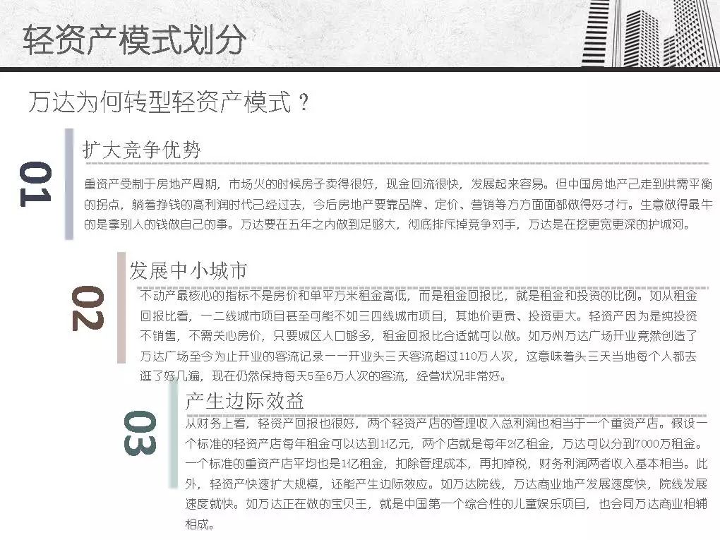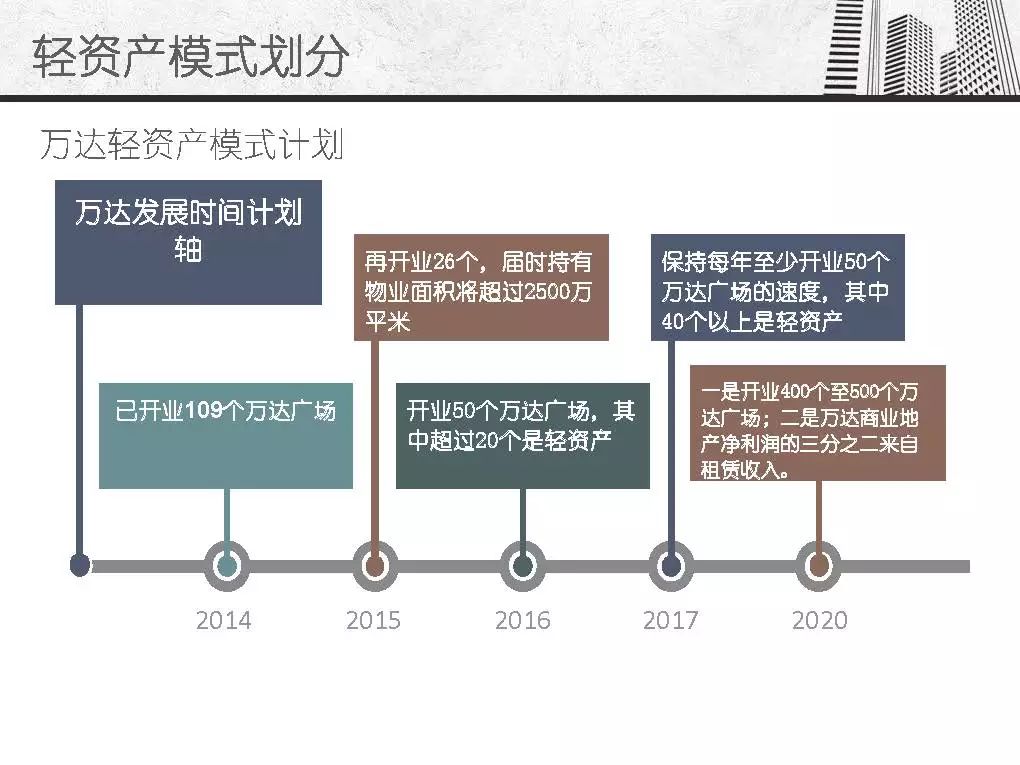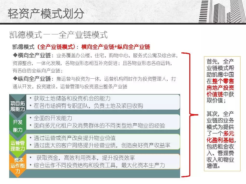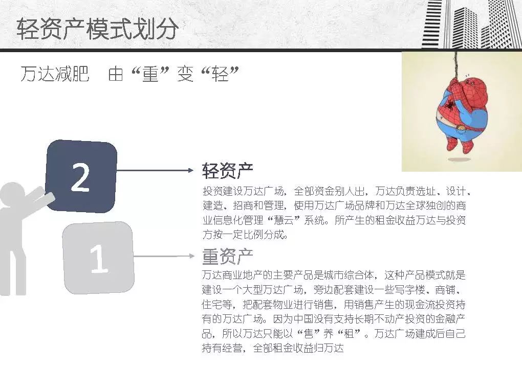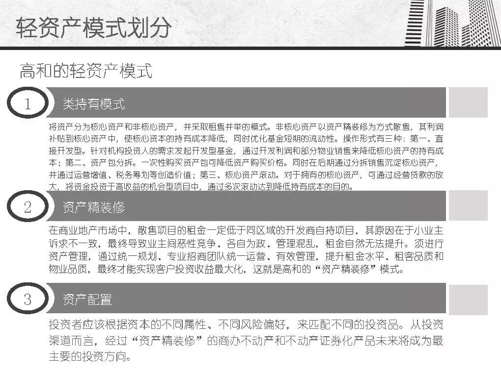 而商业地产轻资产模式发源于美国房地产企业,主要指分工专业、资产轻型化、房地产开发从投资到开发、规划、设计、建筑、后期物业管理、服务分别由产业链条上的专业公司分别完成,其资金更多的来源是社会大众,只有15%左右是银行资金。