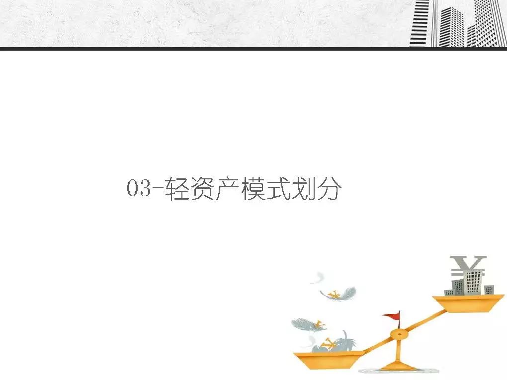 轻资产模式由麦肯锡咨询公司首先提出,具体定义为:在资源有限的形势下,以智力资本的运营为基础,杠杆利用各种资源,从而实现以最低的投入得到最大化的商业运营模式价值的战略管理。在轻资产模式中,企业主要依靠自身的核心价值进行发展,而不是核心业务发展。