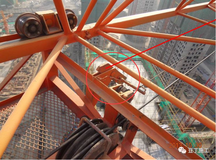 被铁丝固定的变幅钢丝绳防断绳保护装置。违反GB5144中6.4条