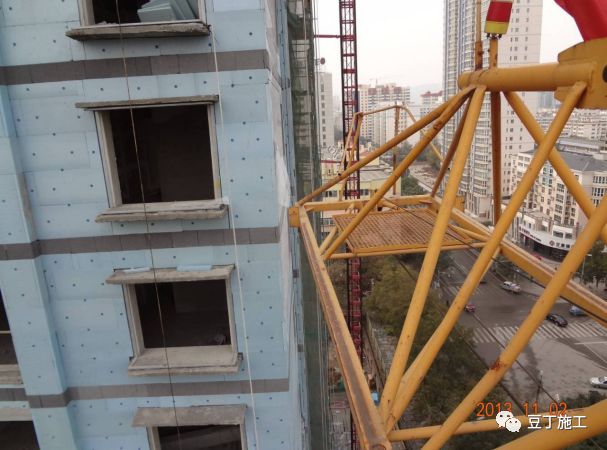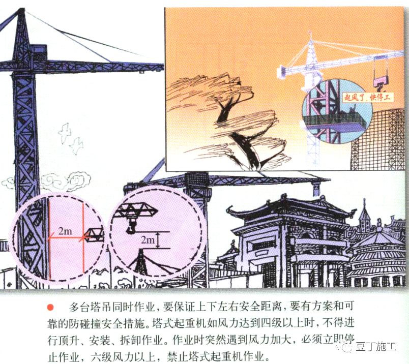 起重臂距离已有建筑物较近,易造成与吊篮碰撞,塔吊在非工作状态下不能360°自转。