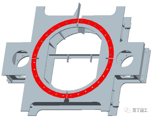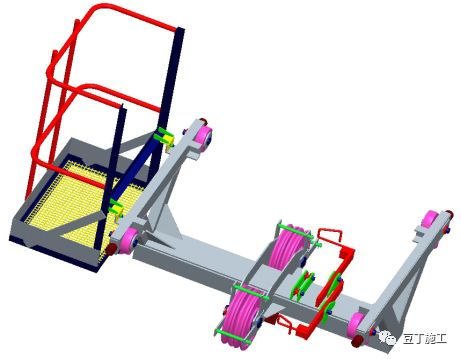 液压顶升机构由塔身过渡节、套架、顶升液压缸和工作平台等组成。其中套架内装有导向滚轮,滚轮和塔身的间隙可调,套架中部装有工作平台,平台的一侧装有滑道或小车,供塔身待加节水平移动用,套架顶部和塔身过渡节固定连接。