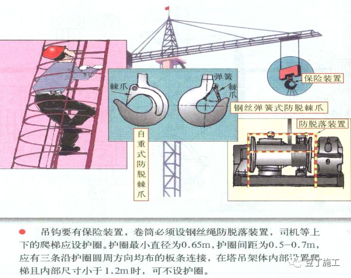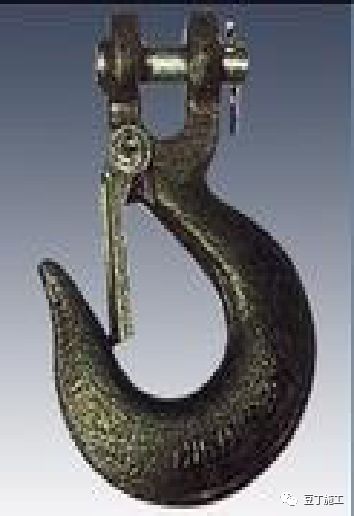 防止当塔吊工作时,重物下降被阻碍吊钩仍继续下降而造成的索具脱勾事故。此装置在吊钩开口处装设一弹簧压盖,压盖不能向上开启只能向下压开,防止索具从开口处脱出。