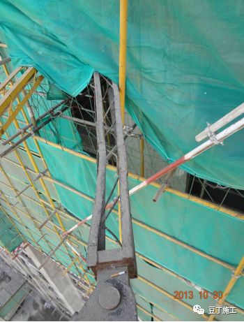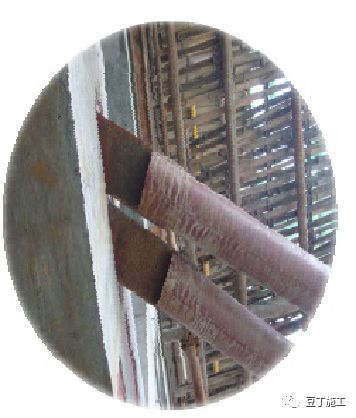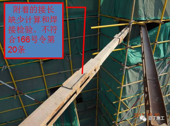 错误图例:自制附墙杆端部与建筑物墙上预埋件垂直焊,焊接质量得不到保证。又给日后拆卸附墙杆带来安全隐患。