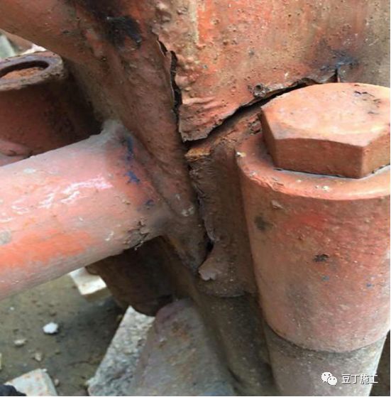 塔机因基础长期浸泡在水中致使材料和焊缝严重锈蚀,再或因焊缝表面因油漆覆盖,从而导致工作中不能及时发现,最终致使主材断裂及焊缝撕裂造成塔吊倒塌事故。