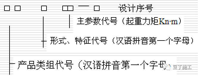 为了快速有效地区别各种塔机的品种规格,我们应当了解我国塔机的型号编制方法。根据专业标准ZBJ04008《建筑机械与设备产品型号编制方法》的规定,我国塔式起重机的型号编制图示如下: