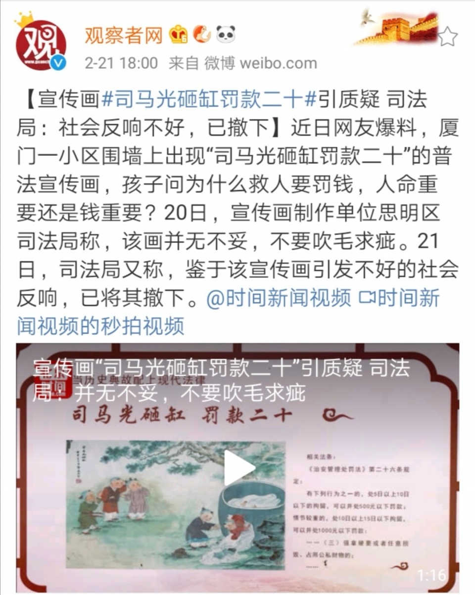 近日网友爆料,厦门一小区围墙上出现“司马光砸缸罚款二十”的普法宣传画,孩子问为什么救人要罚钱,人命重要还是钱重要?20日,宣传画制作单位思明区司法局称,该画并无不妥,不要吹毛求疵。21日,司法局又称,鉴于该宣传画引发不好的社会反响,已将其撤下。