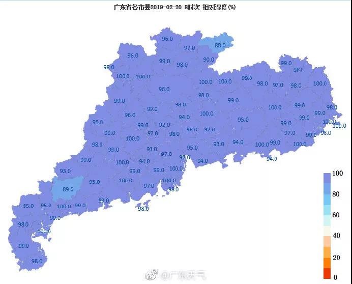 ▲ 2 月 20 号的广东相关湿度图 湿哒哒一片