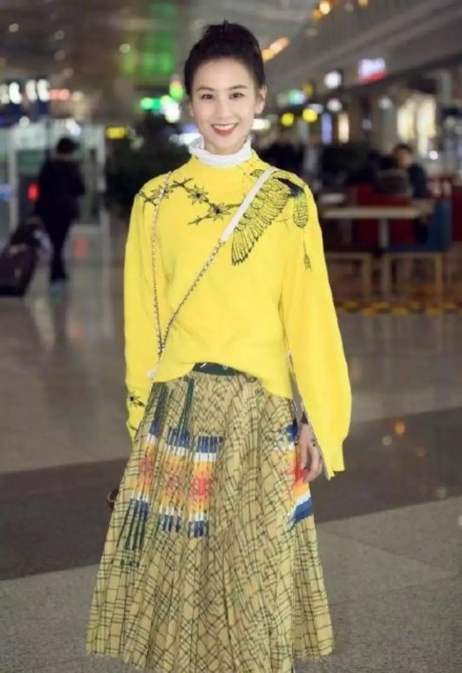 黄圣依一身黄色系Look穿出了初春的明亮,黄色毛衣+黄色格子百褶半身长裙,温婉优雅,青春靓丽,白色荷叶边领子外露充满少女心,扎着简单的高马尾,笑容甜美,减龄十足,活力满满,美丽动人。